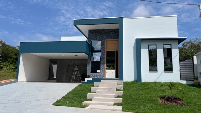 Excelente casa térrea recém construída contendo 3 suítes, sala para 2 ambientes, cozinha com planejados, área gourmet, 1 escritório, wc, lavanderia, piscina, e garagem para 2 vagas.