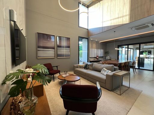 Casa térrea com 324m² de área construída, com três suítes aconchegantes, sendo a suíte master com amplo closet, no piso superior, um ambiente versátil com suíte adicional atualmente configurada como sala de cinema e escritório, podendo ser facilmente revertida em uma 4ª suíte, conforme sua necessidade, sala de estar com pé direito duplo integrado com sala de jantar, cozinha gourmet com churrasqueira, piscina e banheiro social. A casa possuí aquecimento de água por boiler (em torneiras e chuveiros), pisos e revestimentos Portobello, e móveis planejados Plantec. Vendida totalmente mobiliada e decorada, pronta para morar. Ambientes amplos, integrados e bem iluminados.