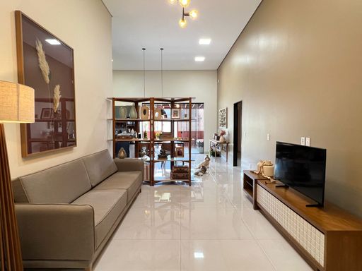 Casa térrea com três suítes amplas, sendo a suíte principal com closet espaçoso e hidromassagem. Dispõe ainda de escritório privativo e lavabo. A área social integra sala de estar e cozinha com pé-direito alto, proporcionando excelente iluminação natural e sensação de amplitude. Possui também uma área coberta que pode ser revertido em área gourmet, com acabamento em madeira. A casa será entregue com móveis planejados de qualidade e centrais de ar-condicionado já instaladas, pronta para morar.