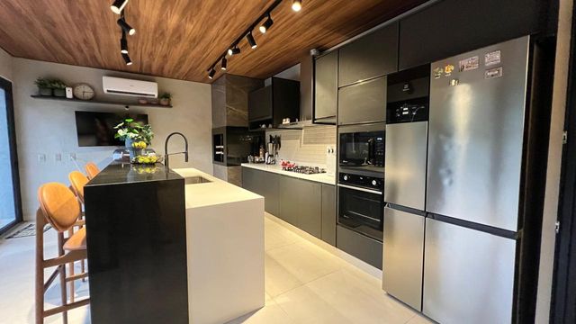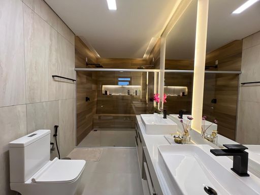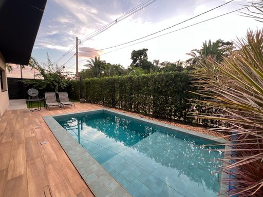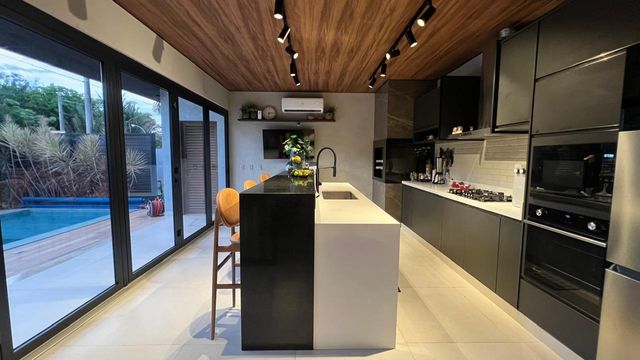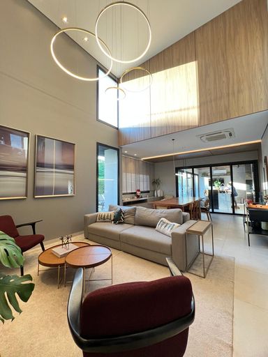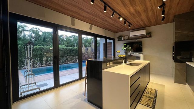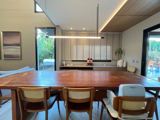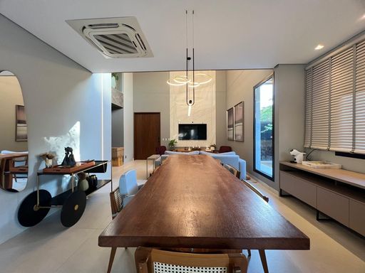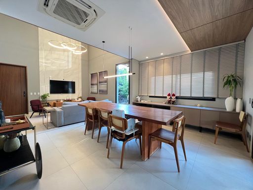 Casa térrea com 324m² de área construída, com três suítes aconchegantes, sendo a suíte master com amplo closet, no piso superior, um ambiente versátil com suíte adicional atualmente configurada como sala de cinema e escritório, podendo ser facilmente revertida em uma 4ª suíte, conforme sua necessidade, sala de estar com pé direito duplo integrado com sala de jantar, cozinha gourmet com churrasqueira, piscina e banheiro social.