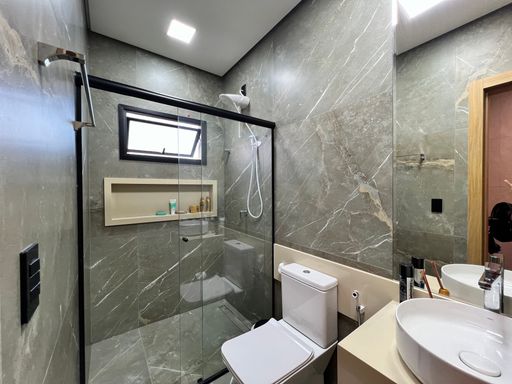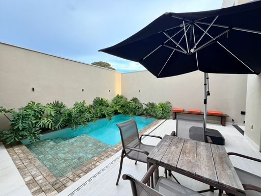 Sobrado com 211,80m² de área construída, com 03 suítes sendo uma com sacada, sala de estar e jantar, cozinha, lavabo, lavanderia, piscina, energia solar e 02 vagas de garagem.